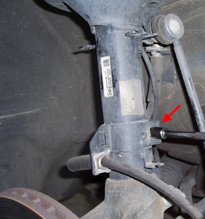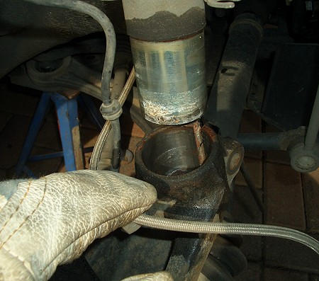 Den Achsschenkel nach unten drücken und den Dämpfer heraus nehmen, dabei oben gegen die Bremsscheibe drücken damit sich der Dämpfer nicht verkantet.